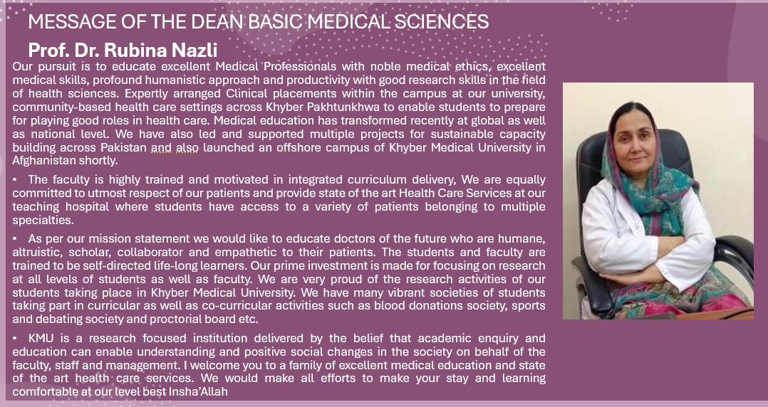 The institute of Basic Medical Sciences is a constituent part of KMU that specializes in cutting edge basic sciences and translational research. In addition to fixing focus on faculty development, research and technology and bringing it at par with international standards, the areas of interest /concern of IBMS would remain the following:-