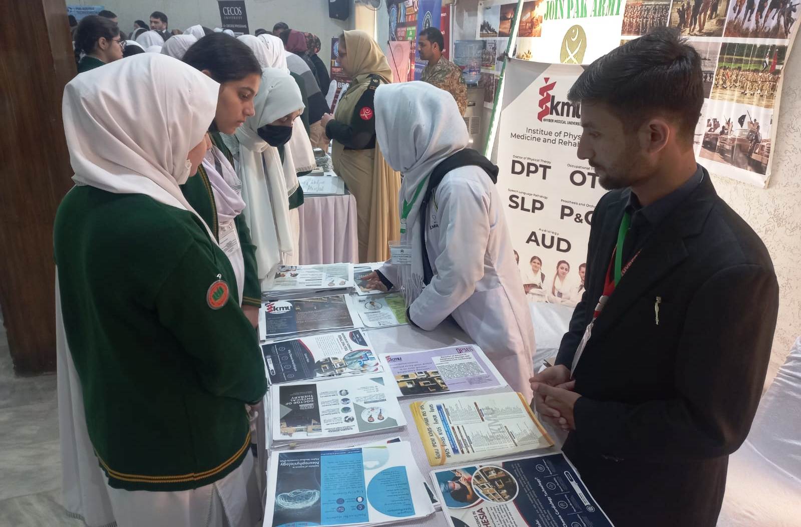 KMU team comprising of Mr. Sahir Atiq, Additional Director Academics and Students ambassadors from 2 institutes visited Army Public School for International Studies (APSIS) Peshawar on their request. Purpose of the event was to provide their students with insights into undergraduate admission processes at leading Universities and offer the guidance and information they need to navigate their higher education journeys. KMU was the only Medical University participated in the event. The students of Army Public School were impressed by KMU's reputation and academic standards. The officials of Army Public School appreciated KMU’s participation in the event and looked forward for further collaboration in various fields.